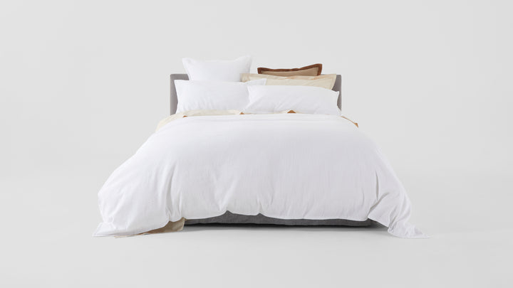 ‘Seersucker’ comes from the Persian word for ‘milk and sugar’. No wonder this bed linen is a household essential. Italian-woven fabric is handmade into Capri in Melbourne by us. Crimped texture means there’s little or no ironing needed.