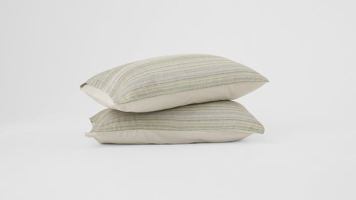 This design is the perfect fibre marriage of 70% linen and 30% cotton. We back this incredible fabric with our Italian 375 thread count sateen cotton for cosy comfort. Try pairing it with our Nova sheeting in either Heather, Sage, Fog or Brio colourways.