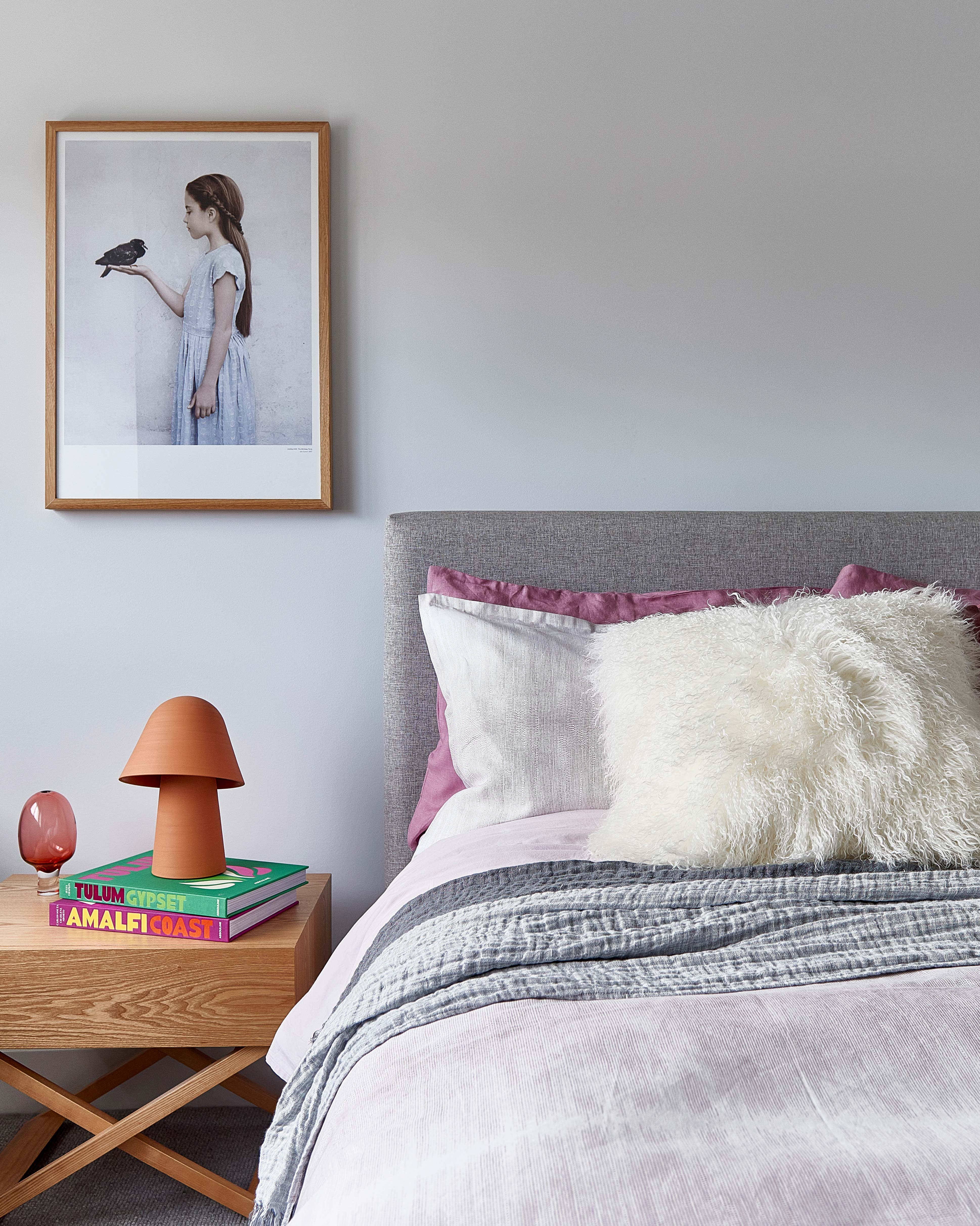 Classic white bed linen is timeless and always looks fresh. A throw blanket and cushions in your theme colour are a simple way to add personality.