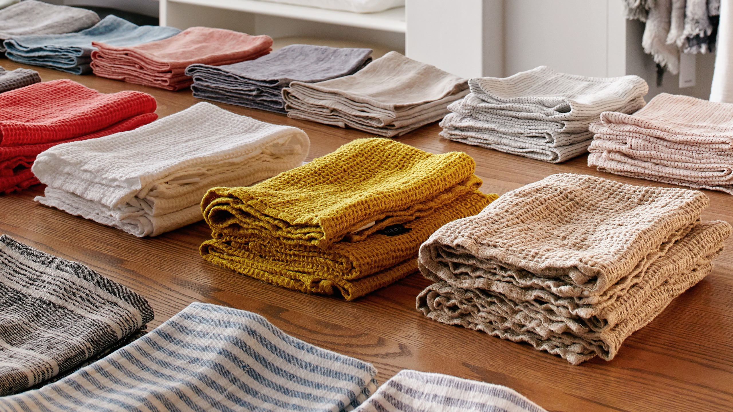 We aspire to seek out the best quality materials to manufacture long-lasting, sustainable and beautiful products. From bed linen to sleepwear and dining products, everything in our range is made from natural fibres, such as fine linen, 100% cotton and pure spun wool. Shown here are our tea towels made from luxurious linen.