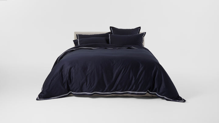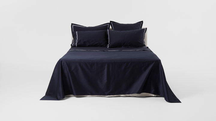 Our Villa fabric is woven in Italy by our expert partners in a silky smooth sateen weave. We make each piece by hand in Melbourne. The quilt cover, flat sheet and pillowcases are finished with a contrasting double row of satin stitch detail.